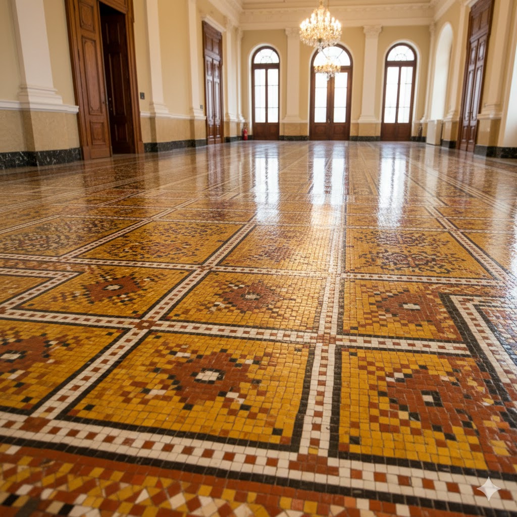 "Recuperamos el esplendor de su terrazo mediante rebaje y pulido con diamante. Corregimos imperfecciones con nuestro tratamiento de juntas, aplicamos un cristalizado de alto brillo y sellado hidrófugo para facilitar la limpieza diaria.